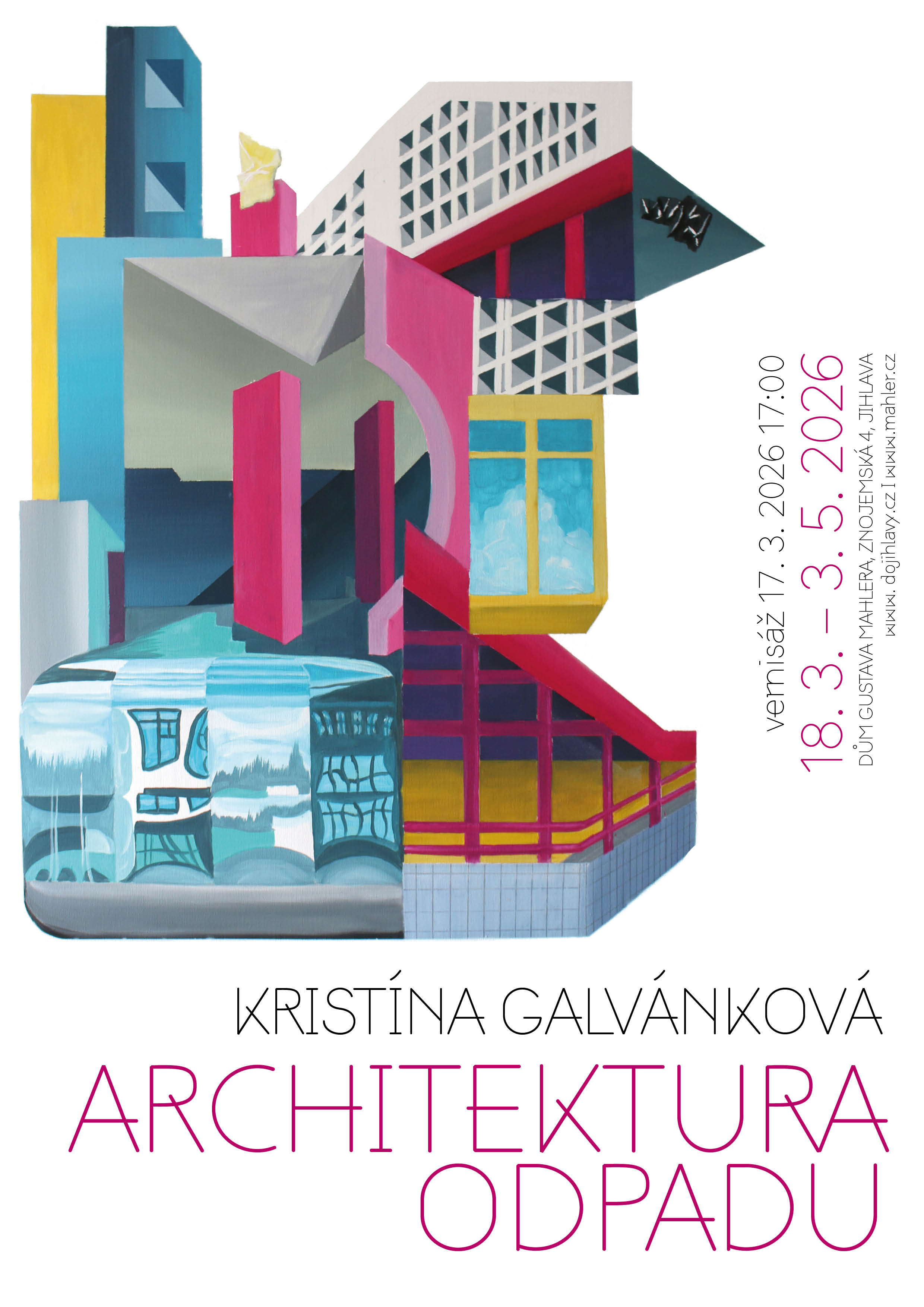 Výstava v Domě Gustava Mahlera s názvem Architektura odpadu představuje tvorbu Kristíny Galvánkové, která dlouhodobě zkoumá městský prostor prostřednictvím malby. Její práce nevznikají jako dokument konkrétních míst, ale jako vizuální záznam pohybu, paměti a vnímání. Autorka si z města neodnáší panoramata, nýbrž fragmenty – odřezky architektur, sklady materiálů, dočasné konstrukce či zbytky odpadu. Tyto prvky následně reorganizuje do vlastního obrazového systému.